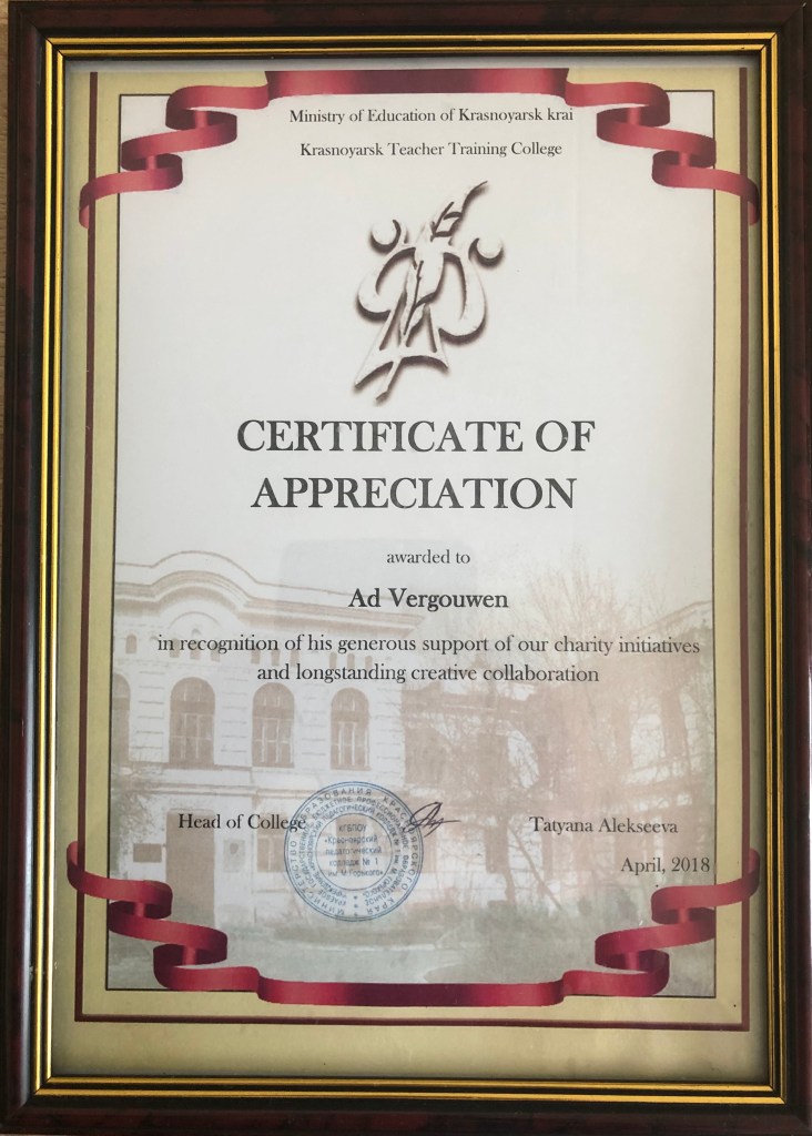Sinds 2000 ben ik gastdocent aan het Pedagogisch College nr. 1 te Krasnoyarsk (Siberie) en in april 2018 mocht ik uit handen van Tatyana Alekseeva het “Certificate of appreciation” in ontvangst nemen, dat mij door het ministerie van Onderwijs en Cultuur in Siberie werd toegekend.